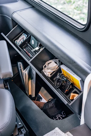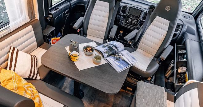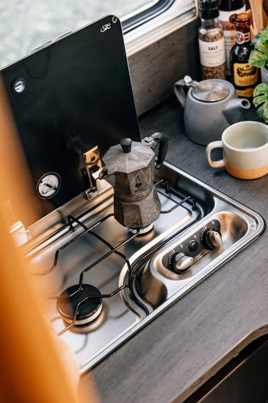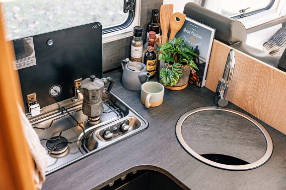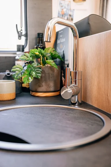 - Vollausgestattete Küche: Zaubere unterwegs kulinarische Highlights! Die ergonomische Küche verfügt über eine stilvolle schwarze Arbeitsfläche, einen 3-Flammen-Gaskocher, Schubladen mit Soft-Close-Funktion und einen großen 156-Liter-Kühlschrank mit separatem Gefrierfach.
