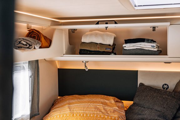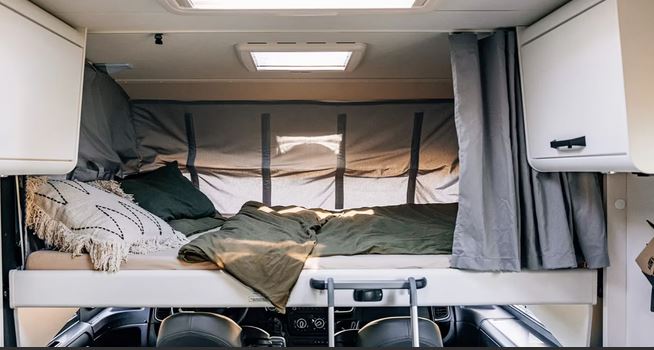 - Flexible Schlafmöglichkeiten: Entspanne in den zwei gemütlichen Einzelbetten im Heck, die sich im Handumdrehen zu einer großzügigen Liegewiese verbinden lassen. Ein zusätzliches, einfach zu bedienendes Hubbett über dem Fahrerhaus bietet zwei weitere vollwertige Schlafplätze.