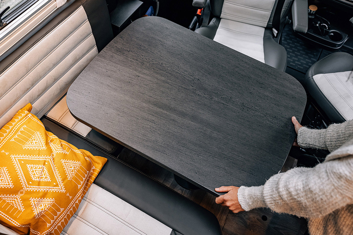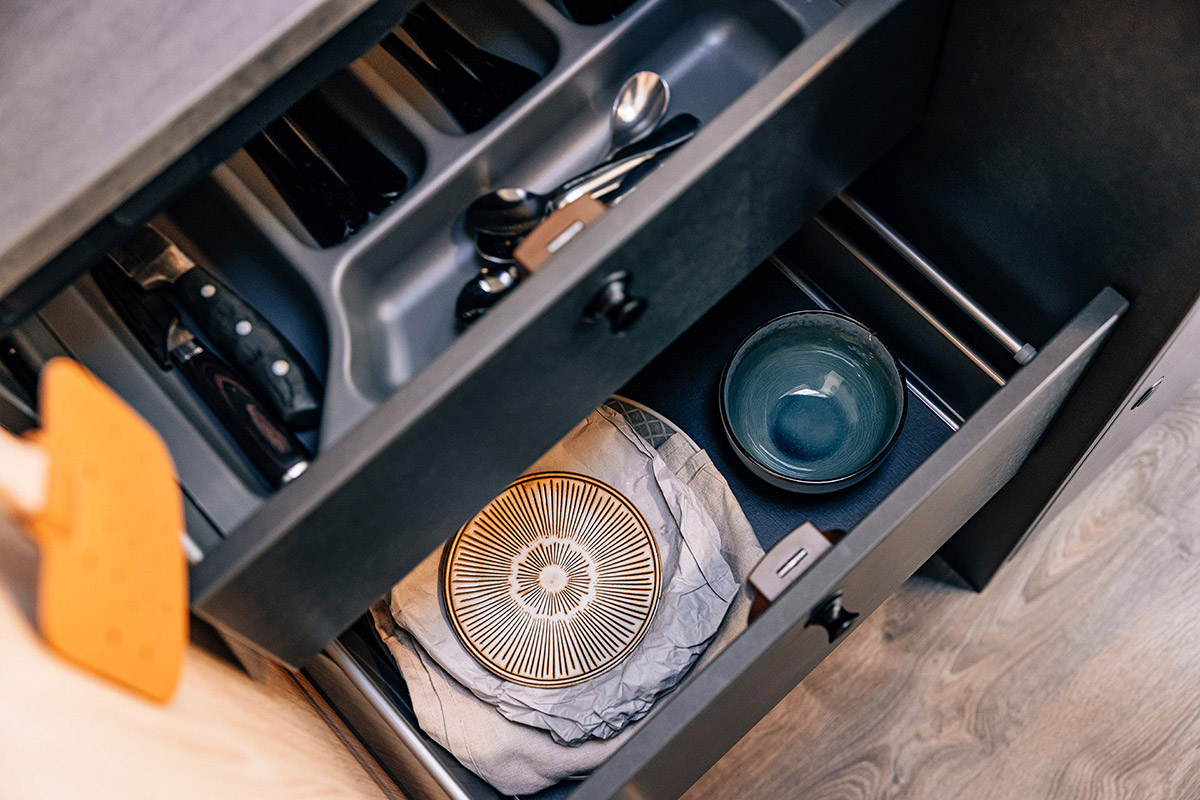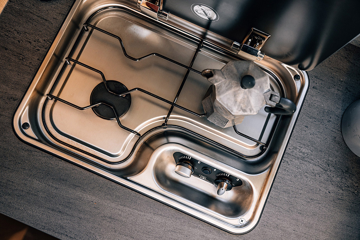 - Vollausgestattete Küche: Zaubere unterwegs kulinarische Highlights! Die ergonomische Küche verfügt über eine stilvolle schwarze Arbeitsfläche, einen 3-Flammen-Gaskocher, Schubladen mit Soft-Close-Funktion und einen großen 156-Liter-Kühlschrank mit separatem Gefrierfach.
