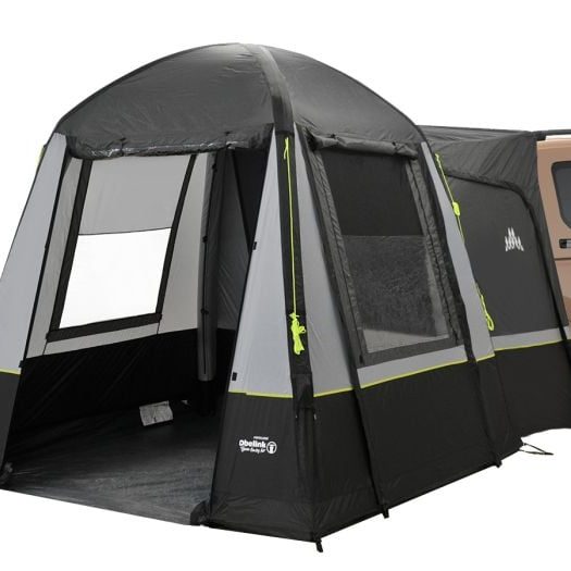 Obelink Portellone Easy Air ist ein freistehendes aufblasbares, freistehendes Zelt mit angenähter bodenplan (gegen Wasser und Ungeziefer), das sich für die Heckklappe eignet. Der Vordereingang und der Seiteneingang des Zeltes können als Sonnensegel genutzt werden.